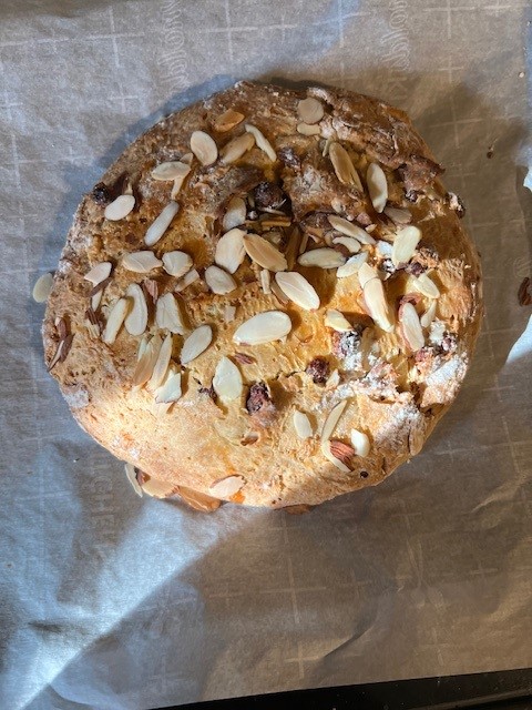 - After 90 minutes, brush bread with egg wash and top with almonds or candy of your choice. Bake cake in an oven pre hearted to 375 degrees for 10 minutes then lower temperature to 320 degrees for 30 minutes.